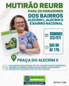 Neste domingo (23), a Prefeitura de Eunápolis, por meio da Secretaria Municipal de Meio Ambiente, realizará mutirão de atendimento do programa “Escritura Legal” na Praça do Alecrim II, das 9h às 17h. A iniciativa visa regularizar a situação fundiária de moradores dos bairros Alecrim II, Alecrim I e Nacional, permitindo que eles possam obter o título de propriedade de seus imóveis. Para se cadastrar no programa, os interessados devem apresentar documentos como RG, CPF, comprovante de residência e recibo de compra e venda do imóvel (se for casado, certidão de casamento, CPF e RG do cônjuge).