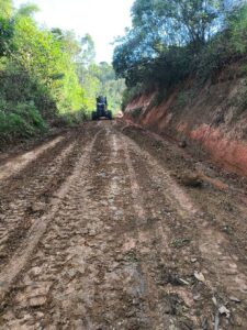 Equipes e máquinas pesadas atuaram no local com frentes de trabalho de cascalhamento, compactação do solo e limpeza completa das vias, melhorando as condições de tráfego para moradores e condutores.