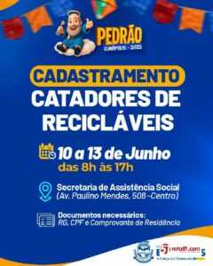 Começa nesta terça-feira, 10 de junho, o período de cadastramento de catadores de recicláveis que desejam atuar durante o Pedrão 2025. A ação é promovida pela Prefeitura de Eunápolis, por meio das Secretarias de Assistência Social e de Meio Ambiente, e segue até a próxima sexta-feira (13), com atendimento presencial na sede da Secretaria de Assistência Social (Av. Paulino Mendes, 508), das 8h às 17h. Para realizar a inscrição, é necessário apresentar RG, CPF e comprovante de endereço.