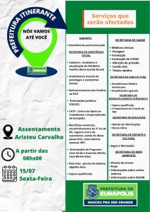 O projeto que já beneficiou milhares de famílias de diversos bairros de Eunápolis, o “Prefeitura Itinerante”, seguirá nesta sexta-feira (15), a partir das 8h, para o assentamento Aristeu Carvalho, comprovando a atenção da gestão em atendimento também às necessidades da população rural, com serviços públicos, assistenciais, de saúde, e lazer.