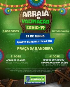 Visando intensificar a promoção à saúde para a população, a Prefeitura de Eunápolis realizará nesta quarta-feira (22) o “Arraiá da Vacinação Contra a Covid-19” na Praça da Bandeira, das 17h às 21h. Serão 3 mil doses disponíveis para a população completar o esquema vacinal, garantindo a eficácia da imunização, principal aliada no combate à doença.