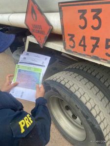 O caminhão apresentava indícios de adulteração em plaquetas obrigatórias de identificação do produto transportado e seu condutor apresentou documento falso no momento da fiscalização.