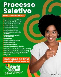 Tá precisando trabalhar? A Prefeitura de Porto Seguro estará contratando novos servidores para melhor servir à população de Porto Seguro. As inscrições estarão abertas a partir do dia 14 até 19 de abril, exclusivamente pelo site, através do link abaixo. Serão mais de 1.000 vagas de emprego, em diversas áreas. Venha fazer parte do nosso time, ajudando a prefeitura a construir uma cidade cada vez melhor! https://seletivo.portoseguro.ba.gov.br A partir da 0h do dia 14/04