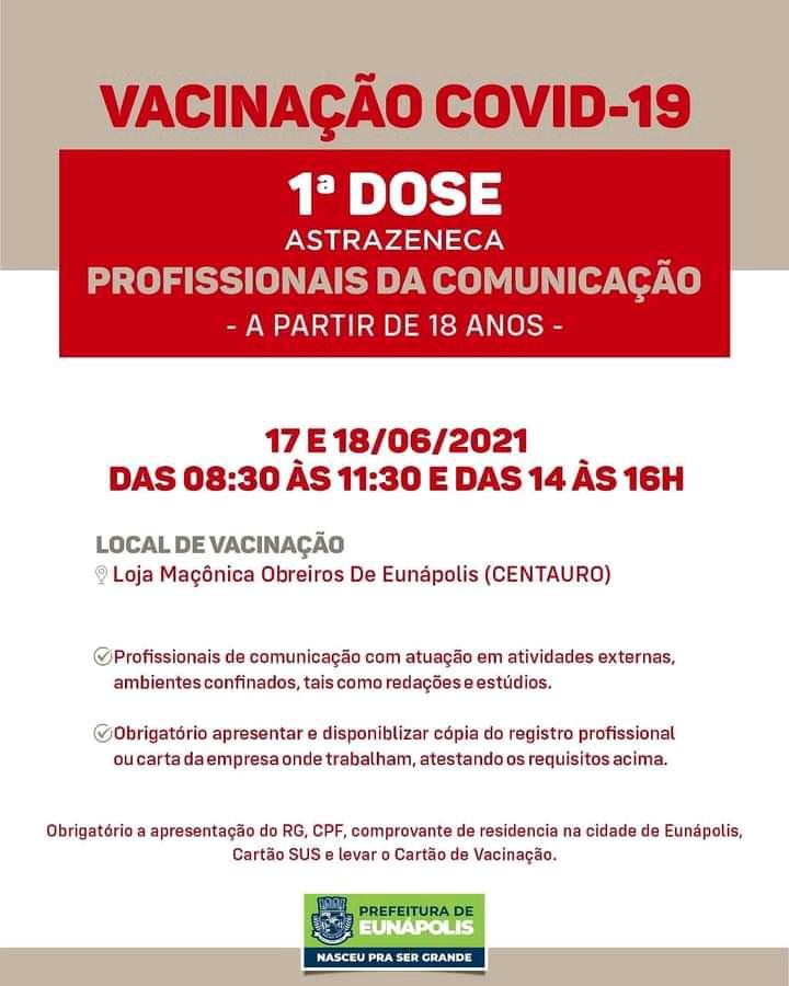A prefeitura de Eunápolis, seguindo o calendário de imunização de grupos prioritários, irá dá início a vacinação dos profissionais da imprensa, na quinta-feira (17) e sexta-feira (18). Serão vacinados os profissionais que obedecerem os critérios exigidos, e com idade a partir dos 18 anos.