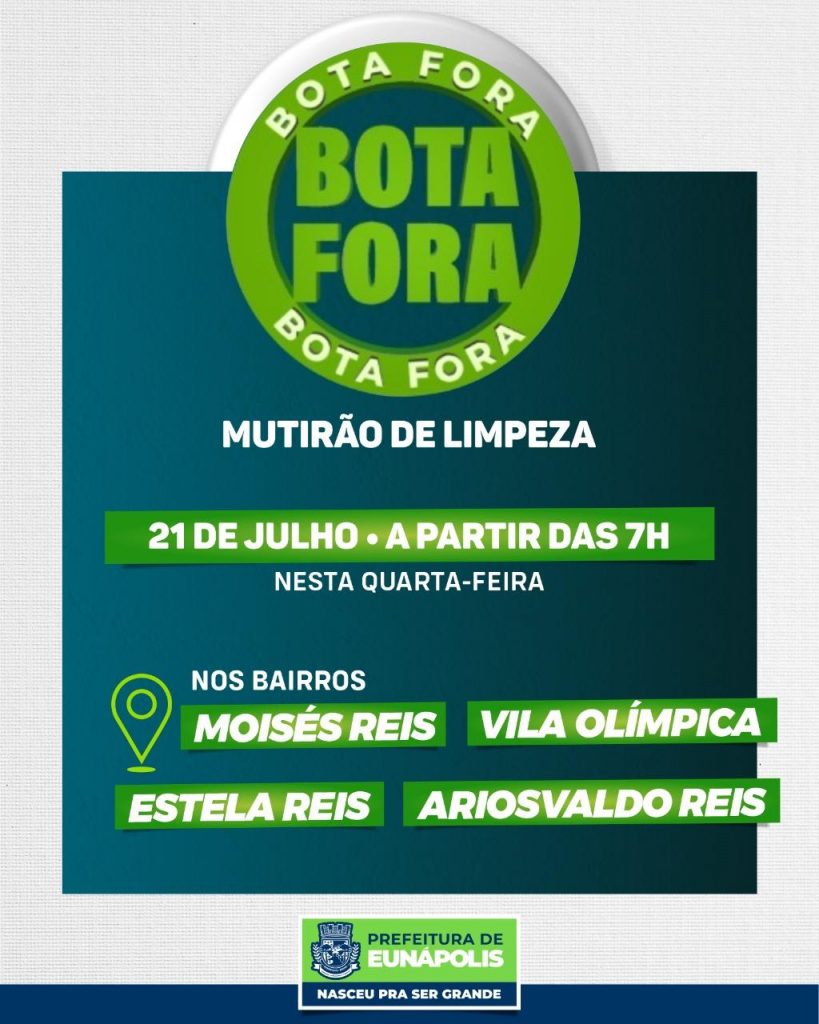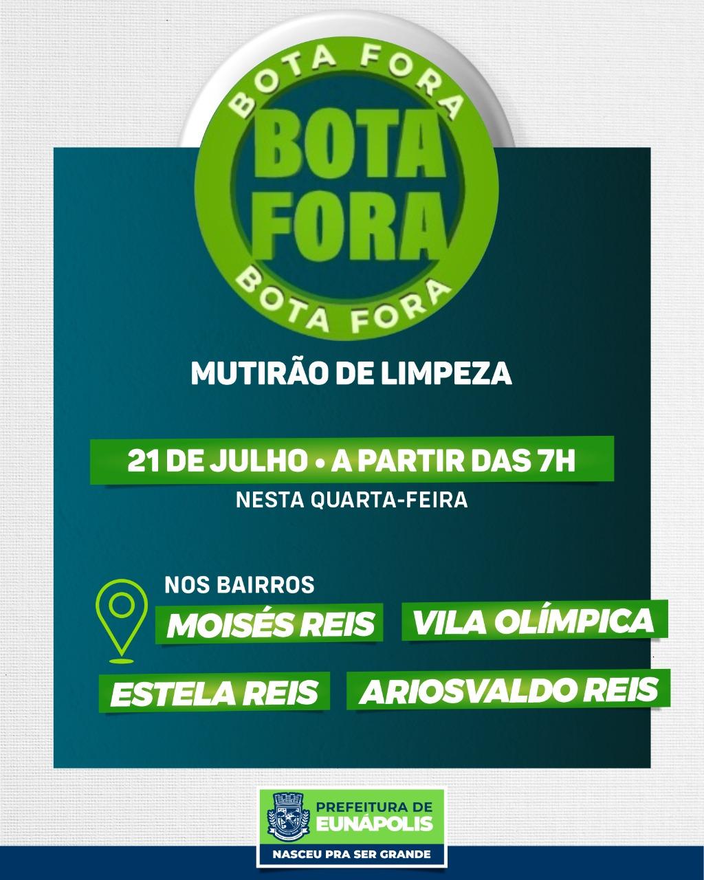 O mutirão de limpeza “Bota Fora”, da Secretaria de Serviços Públicos de Eunápolis, executa mais uma frente de trabalho a partir desta quarta-feira (21/07). Quatro bairros da zona urbana serão atendidos com o programa de revitalização.