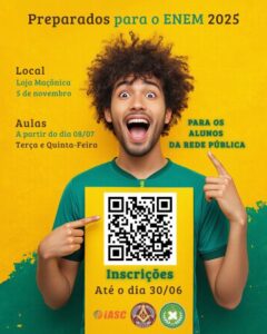 A loja maçônica Fraternidade 05 de Novembro, em parceria com o Colégio IASC e a FRAFEM, vai executar a 3ª Edição do projeto social “Preparados para o ENEM”.