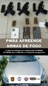 Durante a abordagem e busca veicular, foram encontrados os armamentos e munições listados abaixo. Os três ocupantes, juntamente com o material apreendido, foram conduzidos e apresentados à 2ª Delegacia Territorial de Eunápolis para a adoção das medidas cartoriais cabíveis.