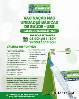A Prefeitura de Eunápolis, por meio da Secretaria Municipal de Saúde, reforça à população eunapolitana a importância da imunização e atualização da situação vacinal de todas as faixas etárias.