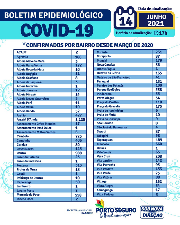 A Prefeitura de Porto Seguro, através da Secretaria Municipal de Saúde, informa que no período de 14/03/2020 a 14/06/2021, foram 21.288 casos de COVID-19, sendo 9.298 confirmados e 11.990 suspeitos, classificados de acordo com a sintomatologia clínica.