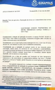 No ofício enviado aos proprietários do Espaço Rondelli, a Secretaria destaca que os organizadores da festa não solicitaram autorização prévia, tampouco apresentaram o local para análise técnica.