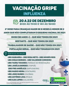 Diante do aumento no número de casos de síndromes respiratórias no município de Eunápolis, a Secretaria Municipal de Saúde informa que está disponibilizando vacinação contra a Influenza (gripe) até esta quarta-feira, dia 22.