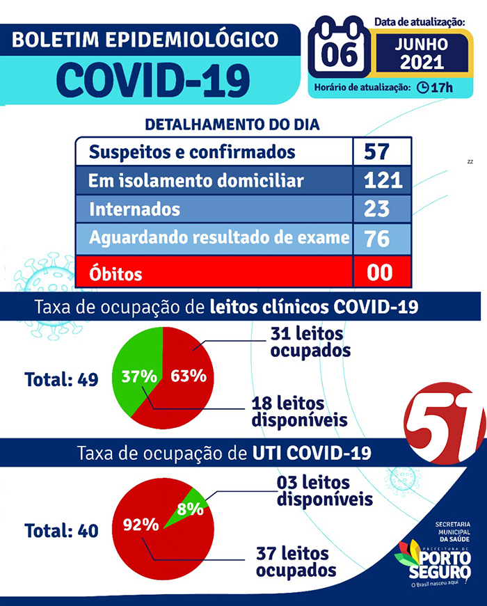 A Prefeitura de Porto Seguro, através da Secretaria Municipal de Saúde, informa que no período de 14/03/2020 a 06/06/2021, foram 20.473 casos de COVID-19, sendo 8.822 confirmados e 11.651 suspeitos, classificados de acordo com a sintomatologia clínica.