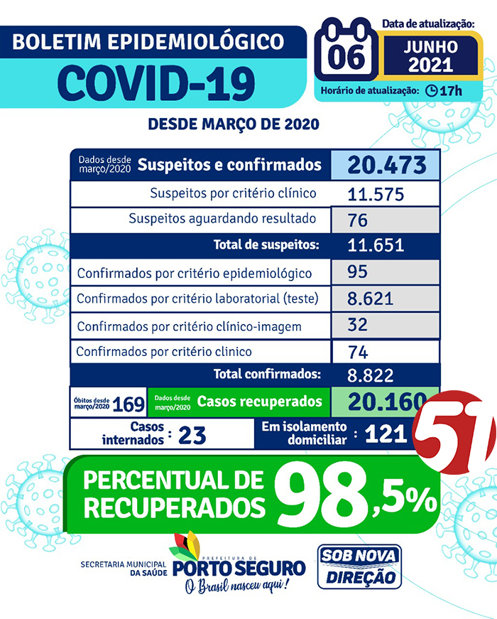 Porto Seguro hoje tem 20.160 pessoas recuperadas, totalizando um percentual de 98,5% entre os suspeitos e confirmados de COVID-19, sendo 169 óbitos desde março/ 2020.