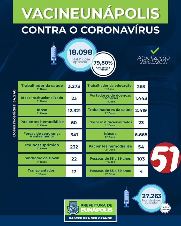 A secretaria municipal de Saúde aplicou até esta sexta-feira (28/05) 27.263 doses da vacina contra o coronavírus. Todos os vacinados pertencem ao grupo prioritário definido pelo Ministério da Saúde para vacinação.