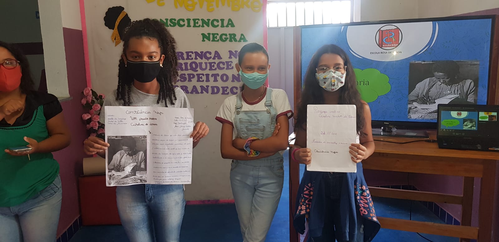 E na literatura a professora Rosangela escolheu três escritores negros para serem pesquisados pelos alunos: Abdias Nascimento, Carolina de Jesus e Conceição Evaristo.