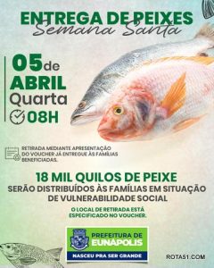 Buscando proporcionar uma mesa farta para as famílias em vulnerabilidade social durante a Semana Santa, a Prefeitura de Eunápolis, por meio da Secretaria Municipal de Assistência Social, entregará 18 toneladas de peixe em diversos bairros, principalmente nas áreas mais carentes da cidade.