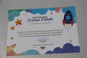 Antes do pequeno expediente, o vereador Artur Dapé, através de uma indicação sua, de nº 29/05, quando visitaram o plenário, os alunos da escola COEDUC, que receberam deste, um diploma de “CRIANÇA CIDADÔ, esta foi uma excelente ideia, quando houve uma demonstração de civismo, para demonstrar a uma criança, o verdadeiro espírito de cidadania, mas para isto, também é necessário, que exista um ensinamento de como formar uma criança, pois só ensina, quem também já aprendeu, principalmente, quando foram retiradas da grade escolar as matérias OSPB e Moral e Cívica, coisa que muitos professores atuais, nem sabe que já existiu, que servia para a formação da criança, pois quando se ensina a uma criança, não é preciso ter que repreender o adulto.