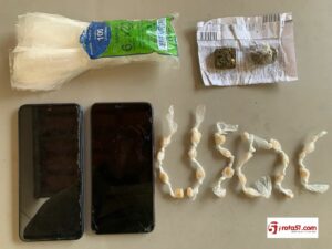RESUMO: Em ronda pelo bairro Farol, as guarnições depararam-se com duas mulheres que ao visualizar as viaturas esboçaram um nervosismo suspeito. Em virtude desse fato, foi dada a voz de abordagem, e após a busca pessoal feita pela policial feminina, foi encontrada no bolso dos shorts da nacional T. D. S., 22 (vinte e duas) pedras de substância análoga a “Crack” prontas para venda e na bolsa que estava com a adolescente K. J. D. S. M. 02 (duas) buchas de substância análoga a “maconha” prontas para venda, além de vários papéis plásticos usados para a embalar drogas e 02 celulares, um de cor azul e outro de cor preta. Pelo fato de haver uma menor envolvida, prepostos do conselho Tutelar foram chamados e acompanharam a guarnição até o plantão de Delegacia na cidade de Itamarajú para a autuação.