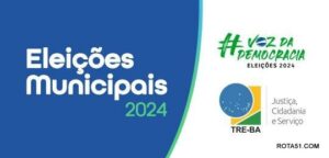 Pra todos verem: Imagem em azul e branco com os dizeres: Eleições Municipais 2024, voz da democracia, eleições 2024 e Justiça, Cidadania e Serviço.