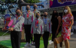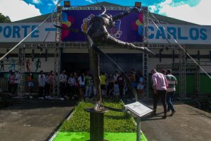 O monumento da ginasta com o laço na mão, de três metros de altura, foi produzido com ferro reciclado pelo artista Diovane. A ginasta Maria Cecília Guastti Nascimento, de 14 anos, representando os atletas de todas as modalidades, disse que ficou muito emocionada e feliz. “É algo enorme saber que Eunápolis é o único lugar da Bahia que tem o monumento da ginástica rítmica, ainda mais para nós ginastas, que lutamos tanto para conquistar medalhas e pódios”, disse a atleta, que venceu um campeonato internacional em junho deste ano.