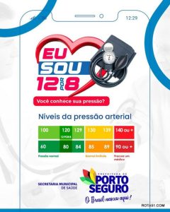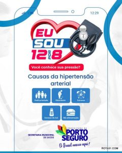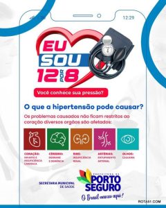Com o objetivo de chamar a atenção da população sobre a importância do controle da pressão arterial e evitar as doenças do coração, a Prefeitura de Porto Seguro está realizando ações de prevenção e combate à hipertensão nas unidades de saúde, com a Campanha “Eu sou 12 por 8”, idealizada pela Sociedade Brasileira de Cardiologia.