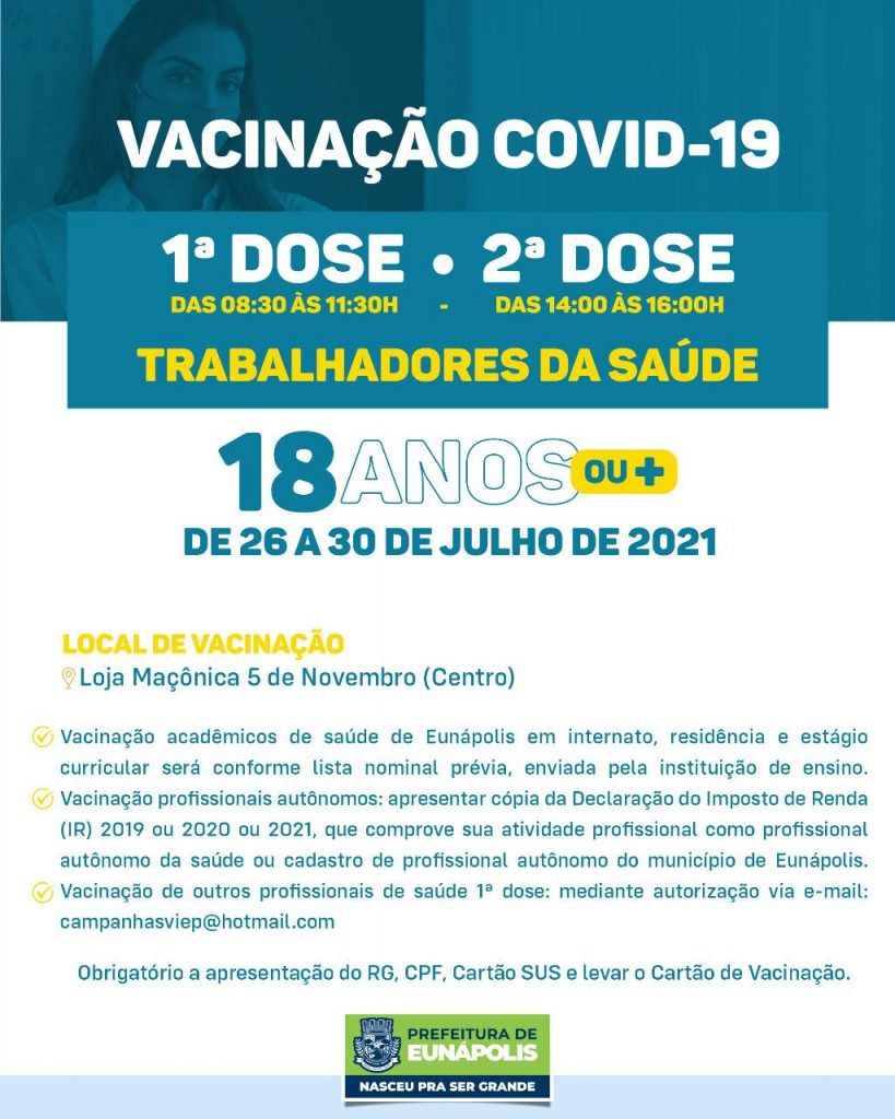 De 26 a 30 de Julho, continua a imunização da 1ª e 2ª dose da vacina contra a Covid-19 disponível para os profissionais da saúde a partir de 18 anos.