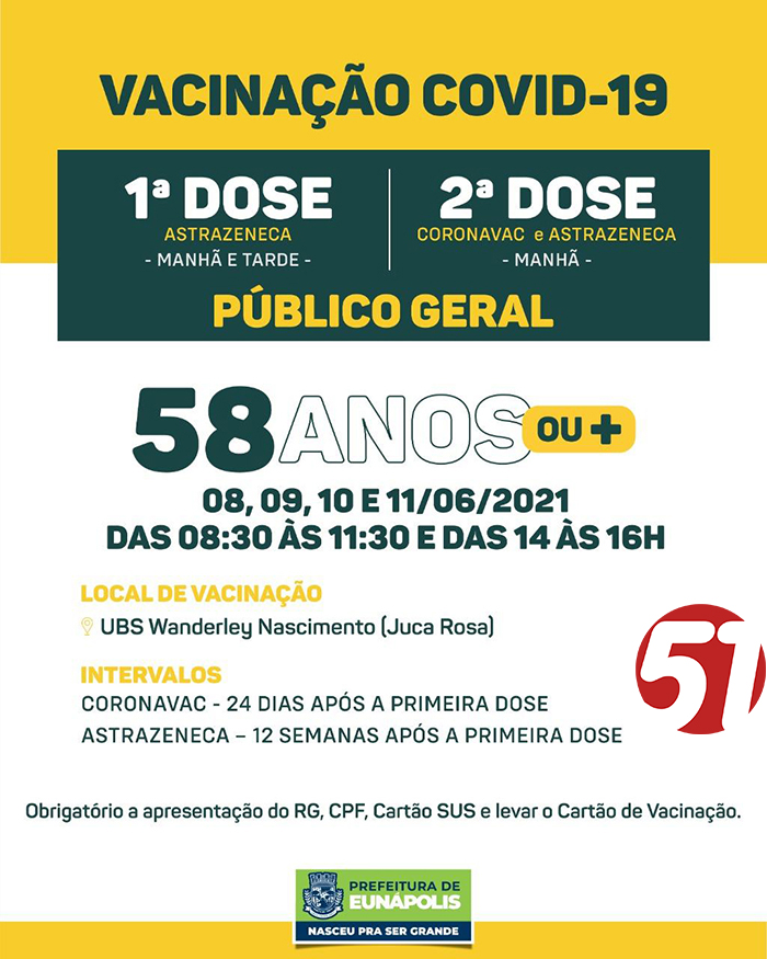 💉 Nos dias 08, 09, 10 e 11 de Junho, Inicia a imunização da 1ª e 2ª dose da vacina contra a Covid-19 para pessoas a partir de 58 anos.