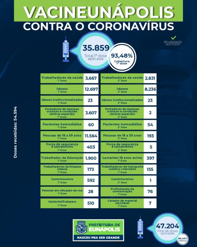 VACINEUNÁPOLIS 💉A secretaria municipal de Saúde aplicou até esta quarta-feira (14/07) 47.204 doses da vacina contra o coronavírus. Todos os vacinados pertencem ao grupo prioritário definido pelo Ministério da Saúde para vacinação.
