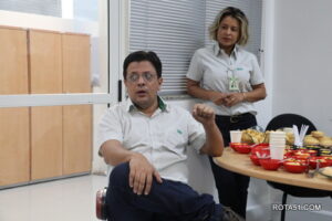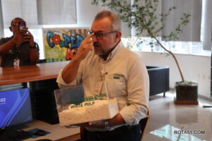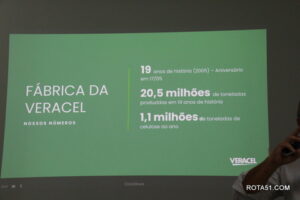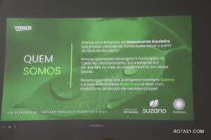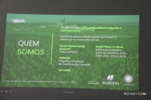 Durante toda a manhã, depois de uma apresentação formal, foi a vez do cafezinho, que sempre é servido com grande diversidade de guloseimas, para depois Ari Medeiros, iniciar toda uma apresentação da Veracel, desde a sua fundação até os dias atuais, quando a produção de fibra de celulose, depois de embarcada, vai para o terminal marítimo de Belmonte, vaio para o Porto se Santos e a partir daí, ganha as grandes produtoras de papel, desde papel higiênico até o famoso papel A4 ou chamex, como é conhecido.