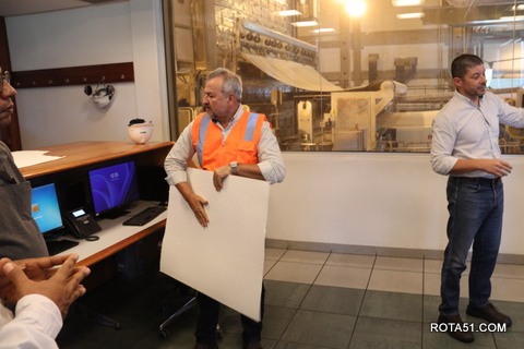 Depois de uma explicação técnica dentro dos parâmetros empresariais, a equipe conduziu o jornalismo, para o setor de embalagens, onde a fibra é cortada, embalada, embarcada e destinada ao TMB, Terminal Marítimo de Belmonte e, a partir daí para o porto de Santos.