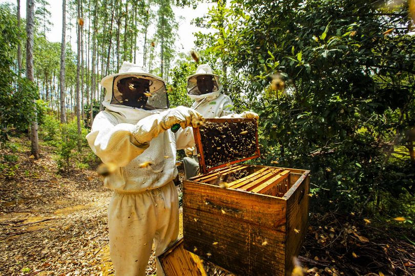 Em parceria com associações de produtores, a companhia fornece materiais e capacita a comunidade para o manejo sustentável das colmeias, protegendo as abelhas e gerando oportunidade de renda para a população da região.